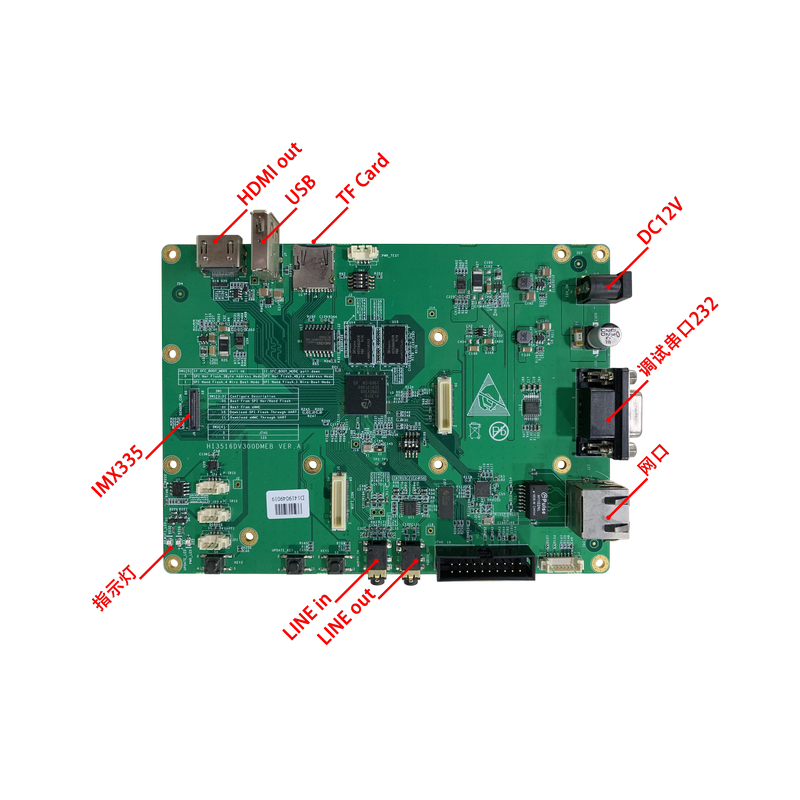 Hi3516DV300標準開發板出廠默認燒寫了測試鏡像,包含uboot、uImage、rootfs及demo程序,用戶拿到開發板之后可接入電視機、音頻輸入輸出線纜、網線、調試串口、電源等外設,測試視頻顯示,音頻輸入、輸出等功能。