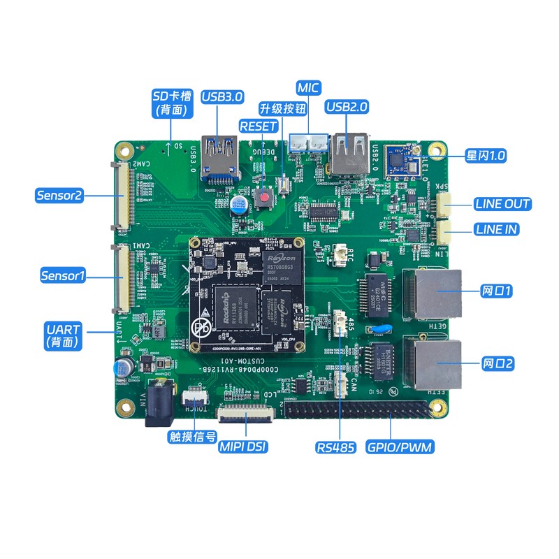 配備豐富接口:多路 USB、千兆網口、MIPI CSI/DSI、串口、CAN 總線、ADC/PWM 等,覆蓋音視頻采集、工業控制、傳感器接入等需求。支持 0℃~70℃寬溫工作,穩定適配工業現場、智能安防、商顯終端等復雜環境,為智能硬件方案開發提供一站式硬件支撐。